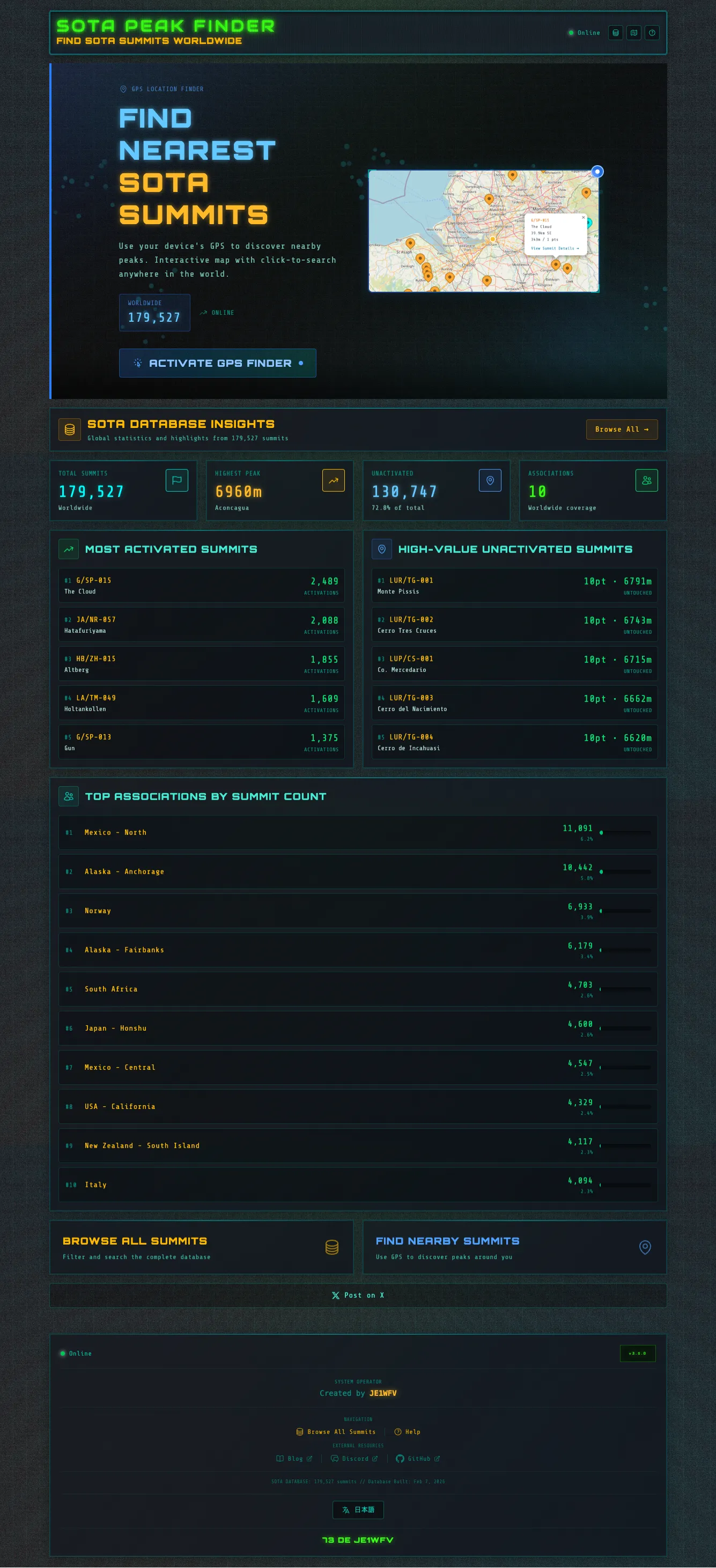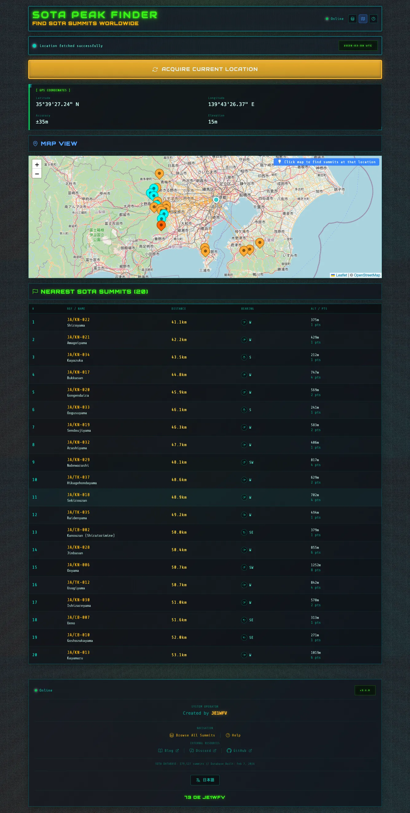 SOTA (Summits On The Air) activators often need to find nearby summits while planning or during activations. With 179,527 summits worldwide in the database, finding the right peak can be challenging—especially when you’re on a mountain with no internet connection.